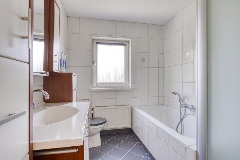 Op de verdieping vind je een keurige overloop die toegang biedt tot drie fijne ruime slaapkamers, waarvan twee met rolluiken. De badkamer is royaal, met een ligbad, aparte douche, dubbele wastafel en toilet. Alles wat je nodig hebt!
