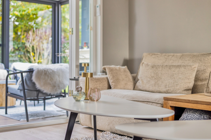 Via de woonkamer stap je zo de nieuwe tuinkamer binnen: een prachtige, onderhoudsvriendelijke uitbreiding met aluminium kozijnen en een schuifpui die zorgt voor een vloeiende overgang tussen binnen en buiten. De tuinkamer biedt het hele jaar door een heerlijke plek om te genieten van zon, groen en rust of eventueel bruikbaar als werkkamer.