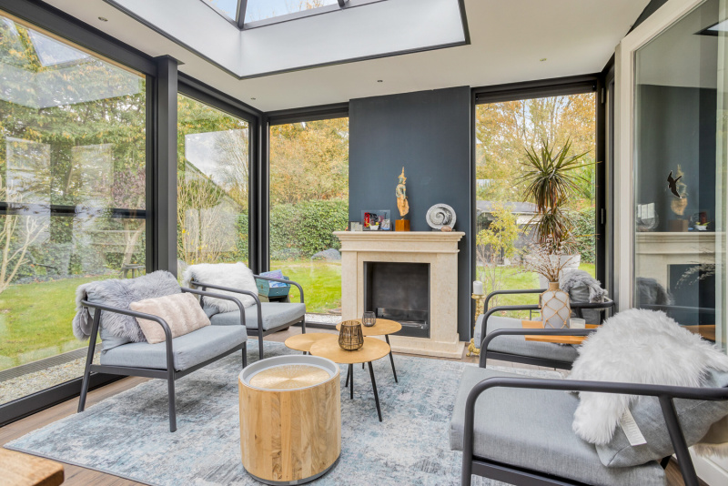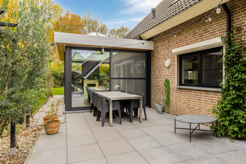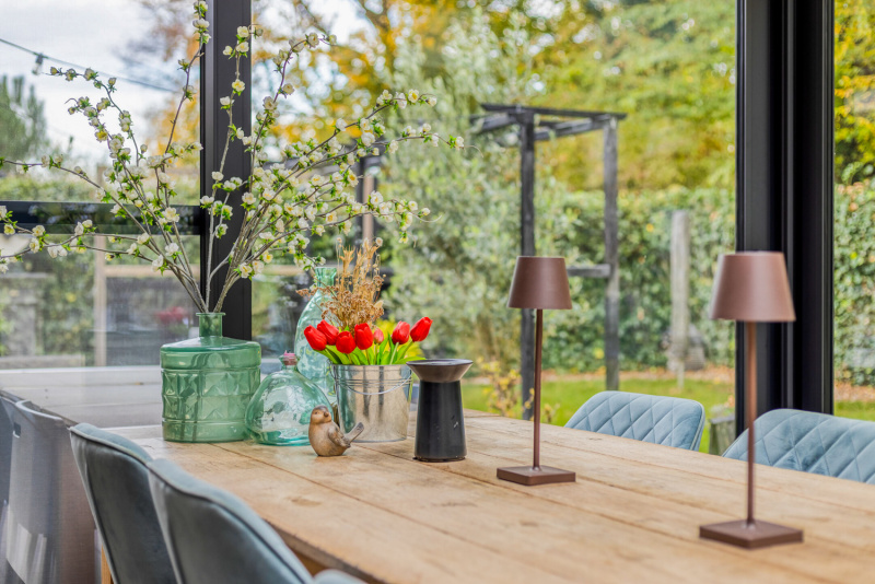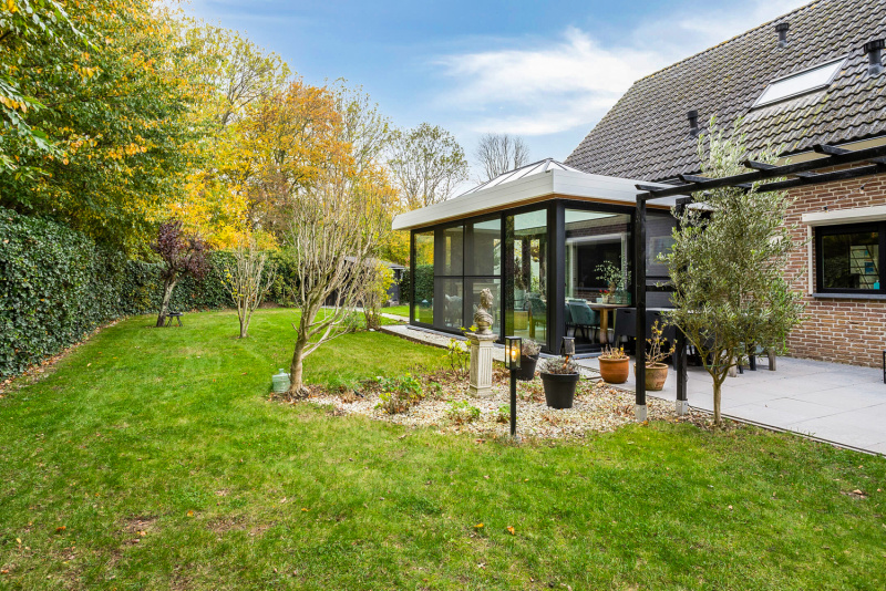 Via de woonkamer stap je zo de nieuwe tuinkamer binnen: een prachtige, onderhoudsvriendelijke uitbreiding met aluminium kozijnen en een schuifpui, voorzien van schuifhorren, die zorgt voor een vloeiende overgang tussen binnen en buiten. De tuinkamer biedt het hele jaar door een heerlijke plek om te genieten van zon, groen en rust of eventueel bruikbaar als werkkamer.