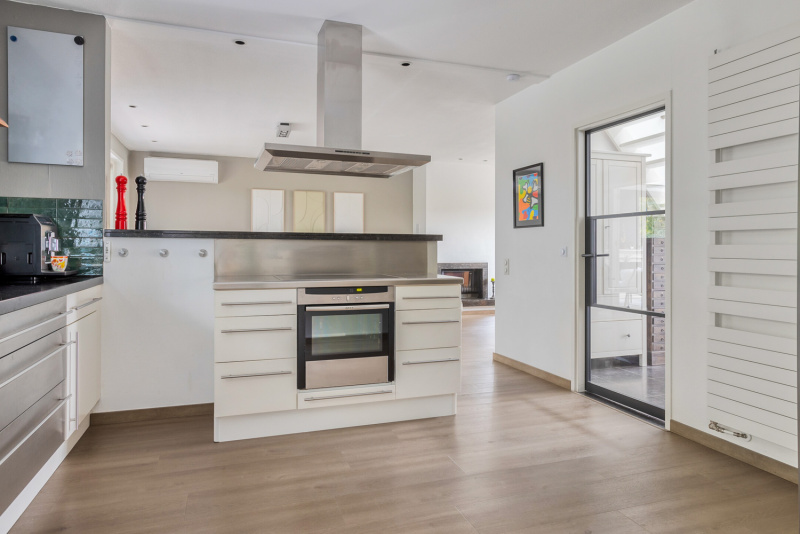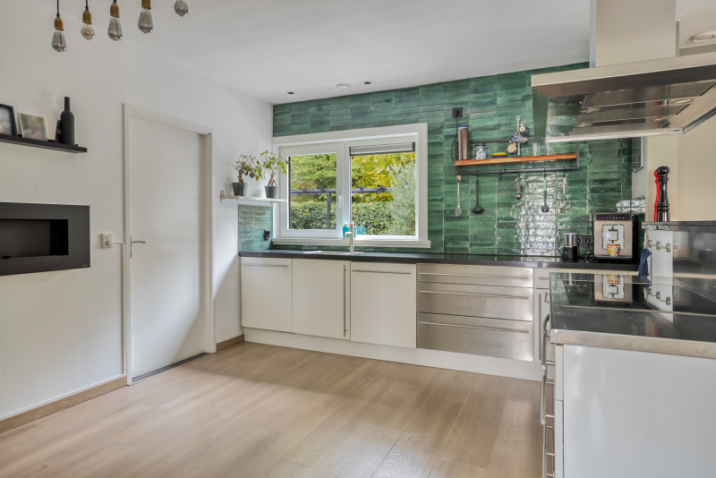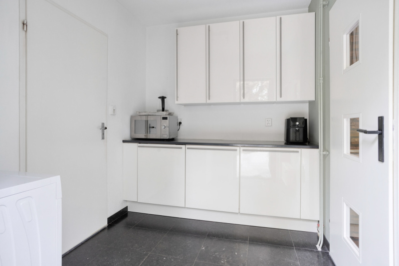 De open keuken is compleet uitgerust met alle benodigde inbouwapparatuur, waaronder een keramische kookplaat, oven, afzuigkap, vaatwasser (2021) en (laden)koelkast. Aansluitend vind je de praktische bijkeuken met witgoedaansluitingen, inbouw diepvries en directe toegang tot de tuin én de garage.