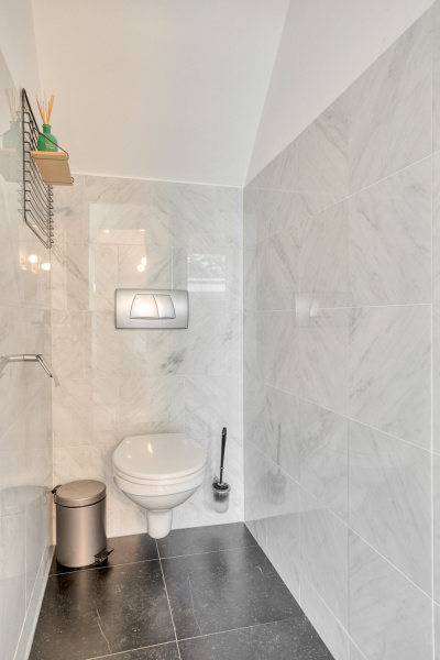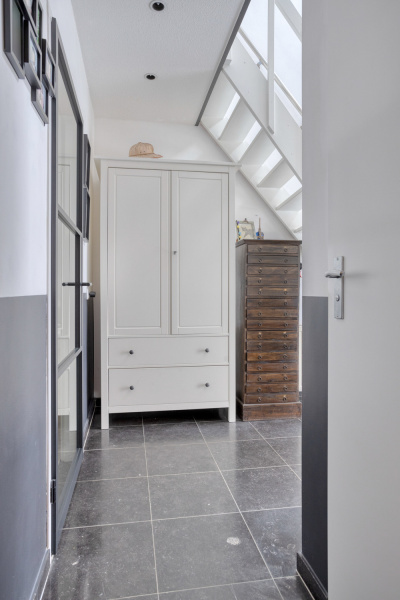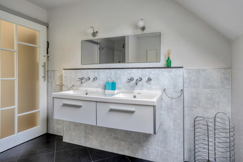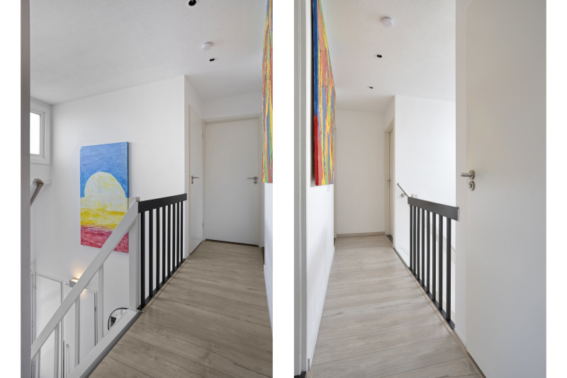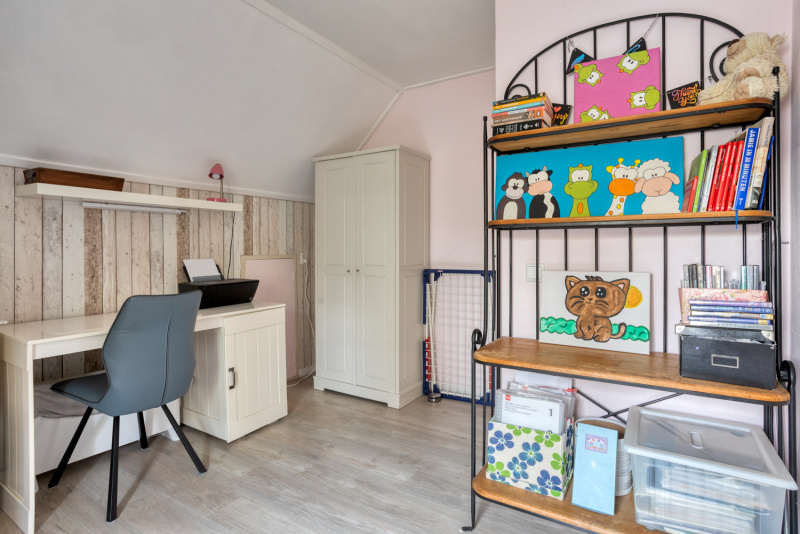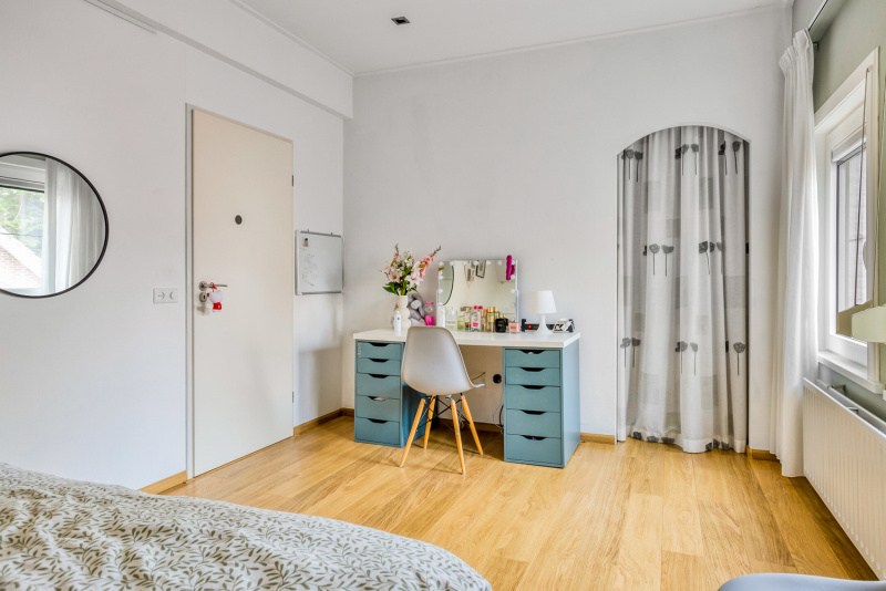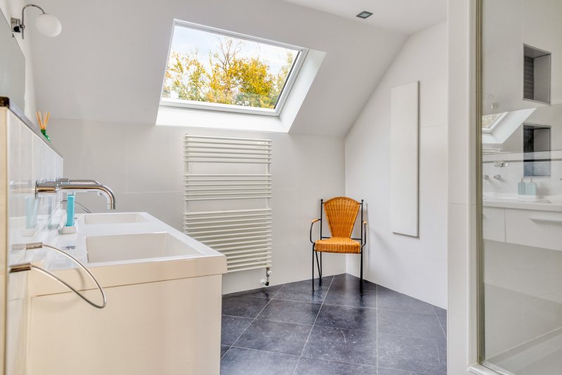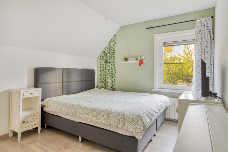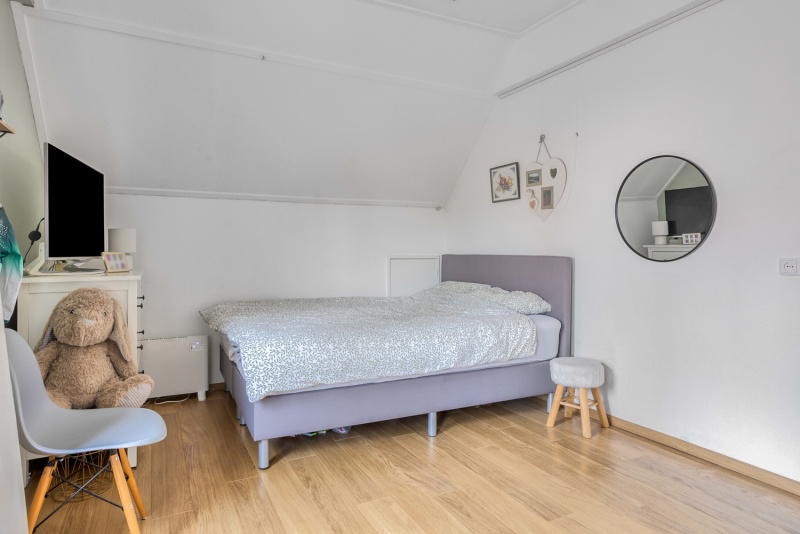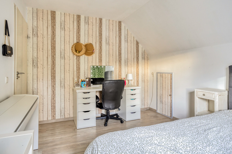 De overloop geeft toegang tot drie comfortabele slaapkamers, een badkamer en een separaat toilet. Alle slaapkamers zijn voorzien van rolluiken en één van de kamers beschikt zelfs over een walk-in closet. De badkamer is modern en uitgerust met een douche, een dubbel wastafelmeubel en groot velux-dakraam, praktisch en stijlvol tegelijk.
