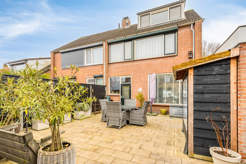 Aan de gevel, naast de achterdeur, is een buitenkraantje aanwezig, praktisch voor tuinonderhoud. Onder de overkapping bevindt zich een aangebouwde bergschuur, perfect voor opslag van zomerspullen.