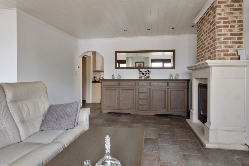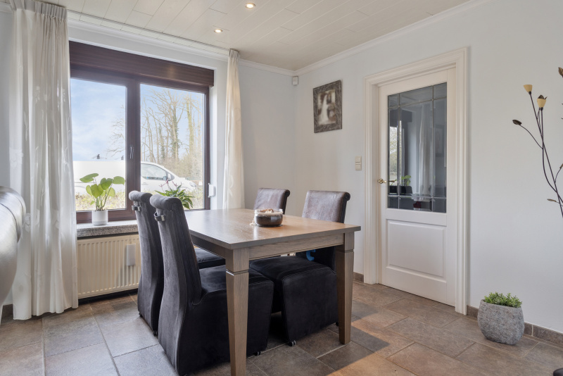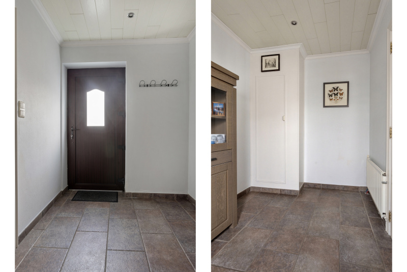 Aansluitend bereik je de open keuken, uitgerust met een vaatwasser, koelkast, combimagnetron, elektrische kookplaat en afzuigkap. Vanuit de keuken loop je door naar een tweede hal die toegang biedt tot het toilet, de badkamer, de trapopgang naar de verdieping, de bijkeuken én de grote inpandige garage/werkplaats/opslagruimte.