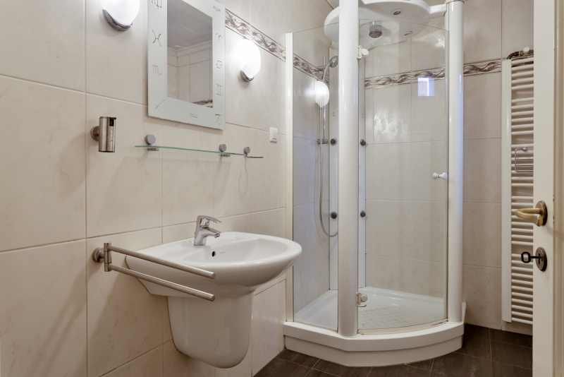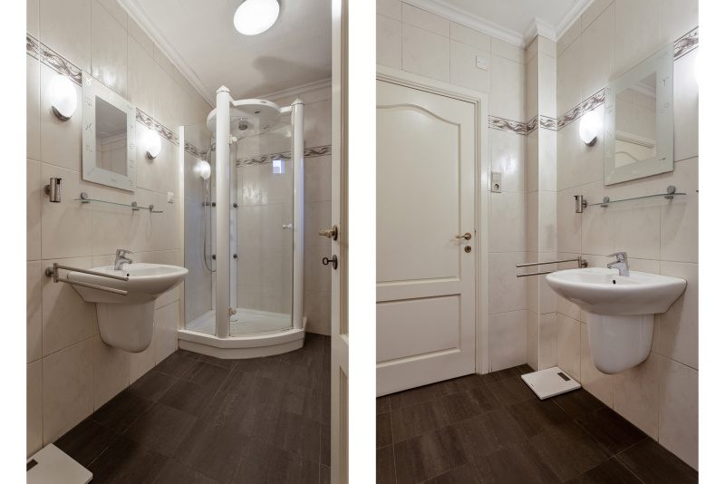 De badkamer is functioneel ingericht met een douche en wastafelmeubel.