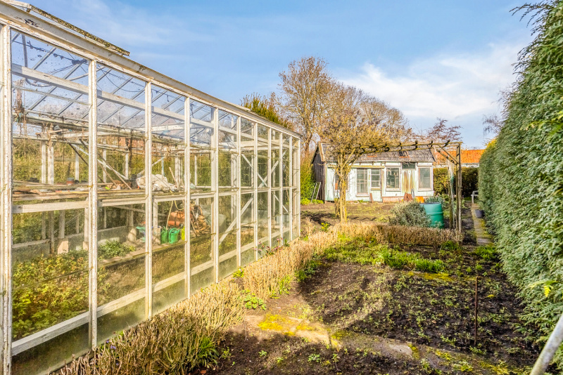 Het perceel van biedt uitzonderlijk veel buitenruimte. De tuin is ingericht met een grote vijver, plantenserre en achterin bevindt zich een eigen wei, ideaal voor kleinvee, hobbydieren of simpelweg genieten van vrijheid en groen.