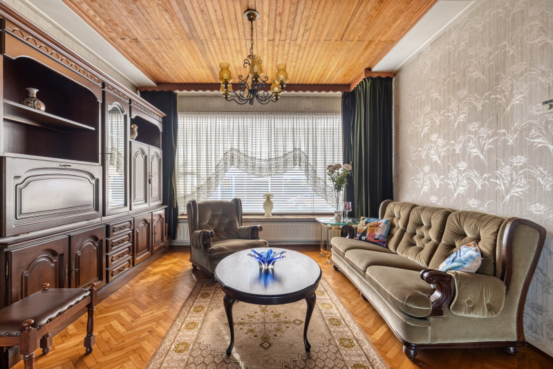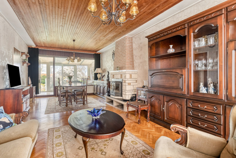 De woonkamer is ruim opgezet en licht dankzij de grote raampartijen. De houtkachel zorgt voor sfeer, terwijl het uitzicht richting de tuin en het groen direct opvalt. Dit is een plek waar je echt kunt ontspannen.