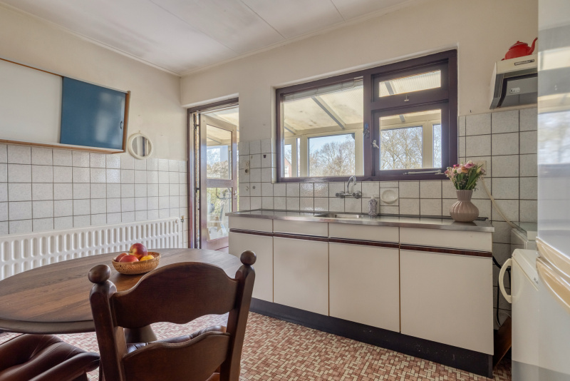 De woonkeuken is praktisch ingericht en biedt volop ruimte, met direct zicht op de tuin en toegang tot de serre.
