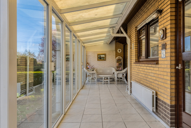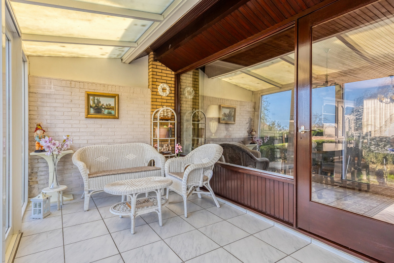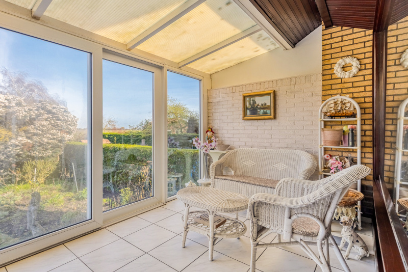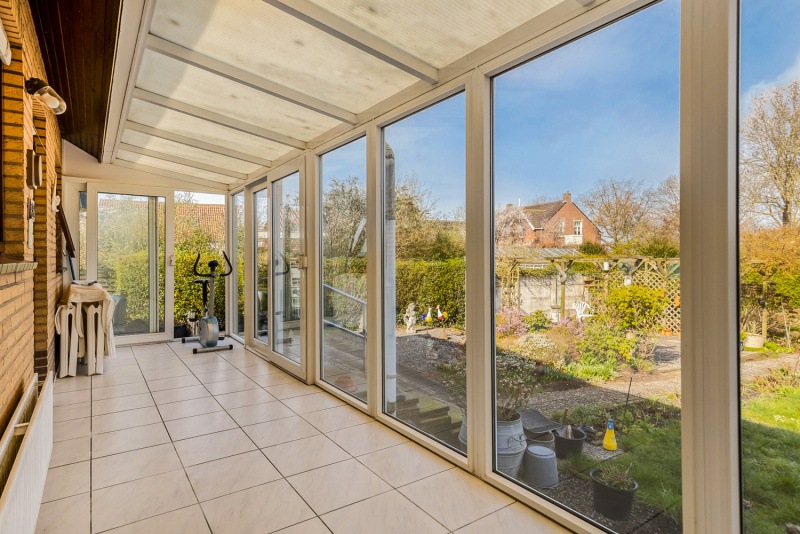 Zowel vanuit de woonkamer als de woonkeuken stap je zo de verwarmde serre in, zonder twijfel één van de sterkste plekken van de woning. Met schuifpuien en een vrij uitzicht over eigen tuin en de polders voelt het hier alsof je midden in de natuur zit.