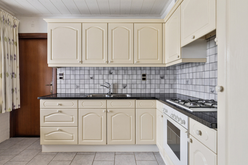 De woonkeuken is praktisch ingericht met een 4-pits gaskookplaat, oven, afzuigkap, koelkast en dubbele spoelbak. Vanuit de keuken heb je zicht op de tuin en toegang tot de bijkeuken. In de bijkeuken bevindt zich een bergkast en de witgoedaansluitingen.