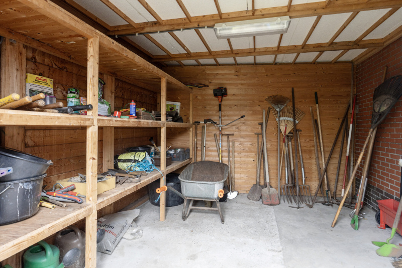 De woning beschikt over een garage voorzien van elektra, water en een elektrische deur. Daarnaast is er een bergschuur en een praktische plantenkas aanwezig.
