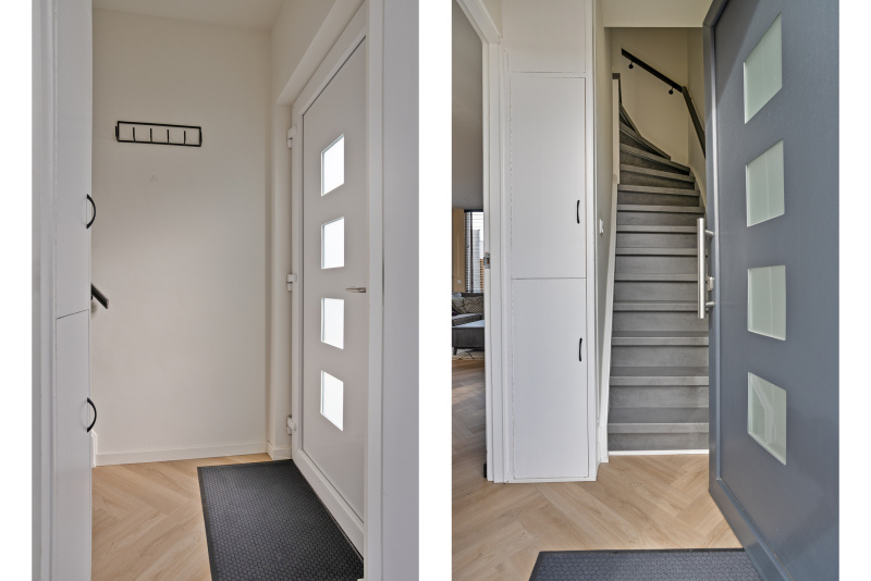Binnenkomst via de vernieuwde kunststof voordeur in de hal, met toegang tot de woonkamer, meterkast en trapopgang.