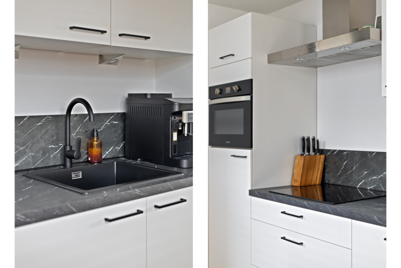 De open keuken is modern en luxe uitgevoerd, met alle benodigde inbouwapparatuur en een strakke uitstraling.