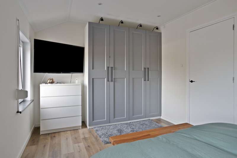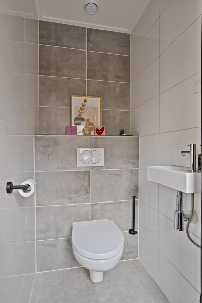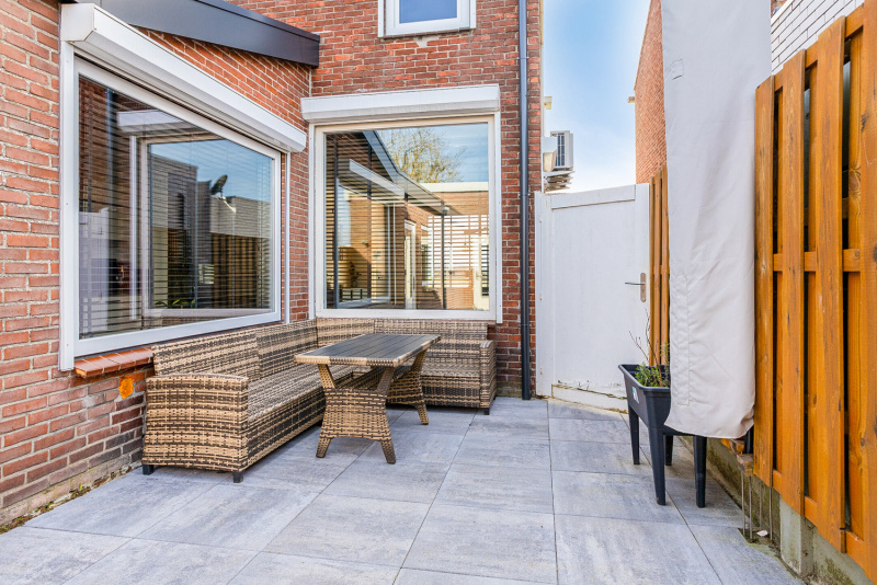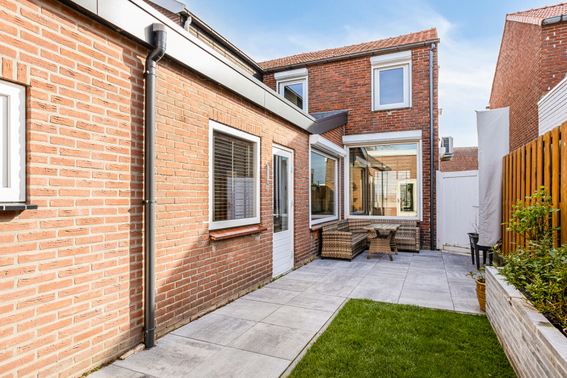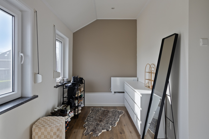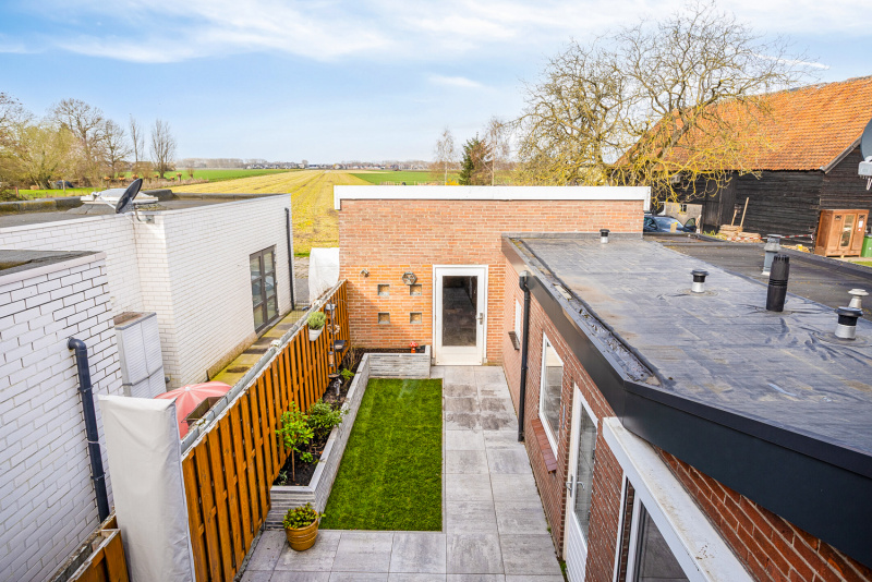 Aan de achterzijde is een nieuwe aanbouw gerealiseerd die zorgt voor extra leefruimte. Hier bevindt zich ook een nieuw toilet en de luxe badkamer. Daarnaast is er een praktische bergruimte met opstelplaats voor de cv-installatie en aansluitingen voor wasmachine en droger.