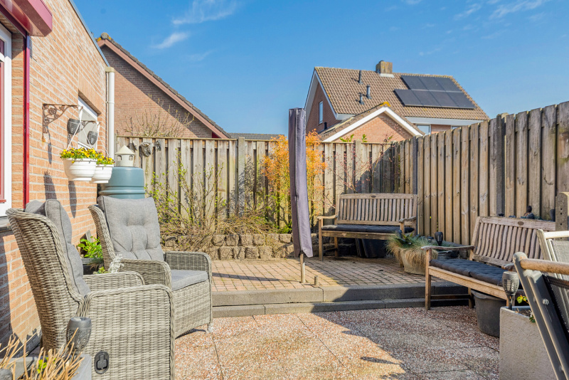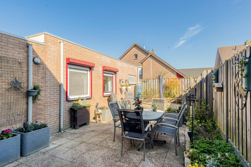 De tuin is onderhoudsvriendelijk aangelegd en biedt een fijne buitenruimte zonder veel onderhoud.