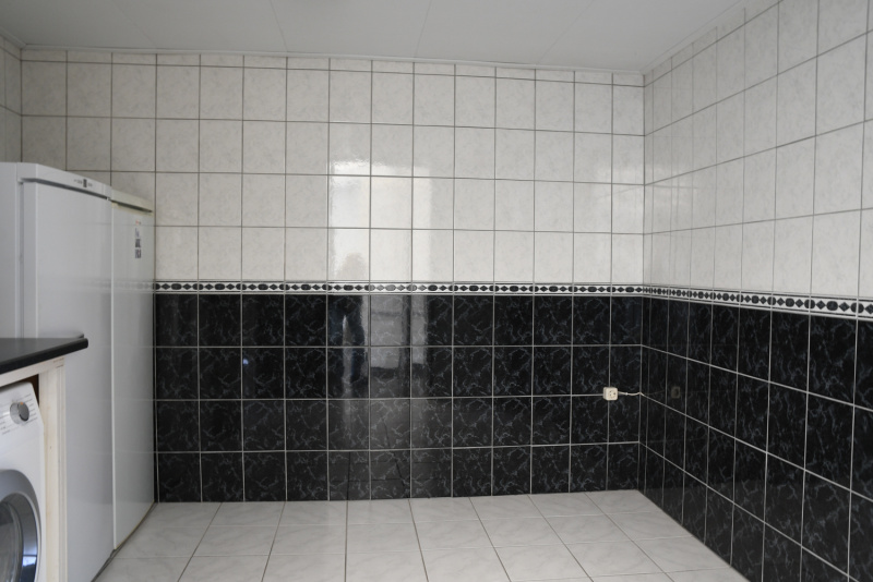 De bijkeuken is betegeld, verwarmd en voorzien van aansluitingen voor wasmachine en droger.