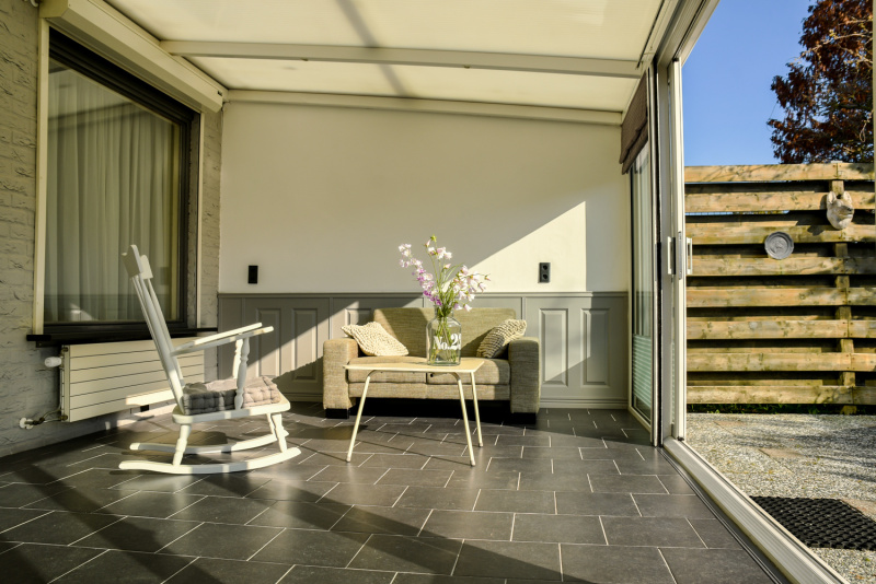 De woning beschikt over een verwarmde aluminium serre over de volledige breedte, wat zorgt voor aanzienlijk extra leefruimte.