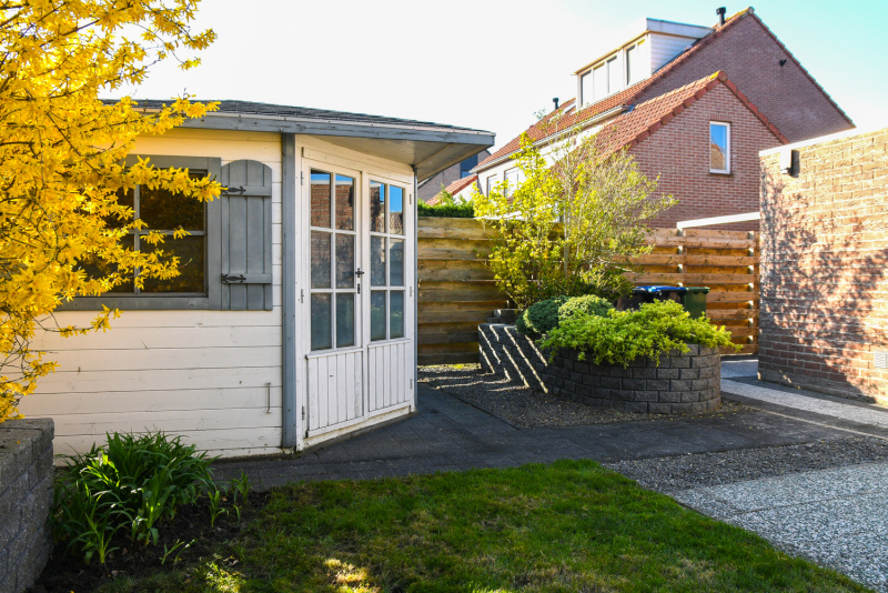 De tuin is netjes aangelegd en gelegen op het zuiden. Met een terras, een tuinhuis en een achterom is dit een fijne en onderhoudsvriendelijke buitenruimte.