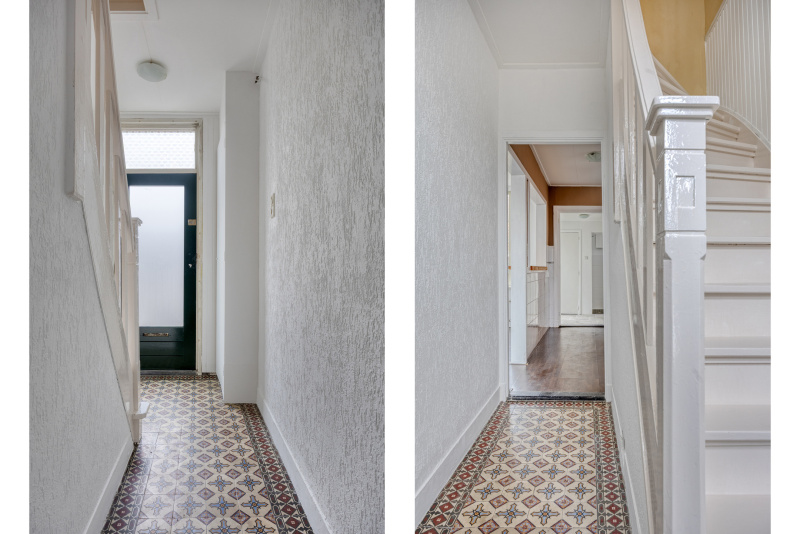 Via de entreehal met authentieke tegelvloer betreed je de woning. Hier bevinden zich de meterkast en de trapopgang naar de eerste verdieping. De woonkamer is sfeervol en licht dankzij de grote raampartijen en het strakke plafond met inbouwspots. Het is een fijne leefruimte waar wonen en ontspannen moeiteloos samenkomen.