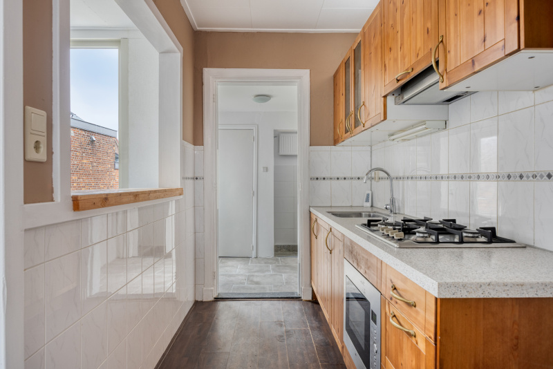 De halfopen keuken heeft een praktische rechte opstelling en is voorzien van gaskookplaat, afzuigkap, oven en spoelbak. Vanuit de keuken bereik je de ruime kelder, ideaal als provisieruimte of extra bergruimte. Aansluitend bevindt zich de uitbouw met bijkeuken, waar plaats is voor wasmachine en droger, evenals de toiletruimte en de doucheruimte.