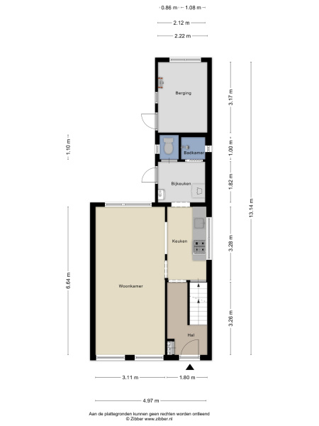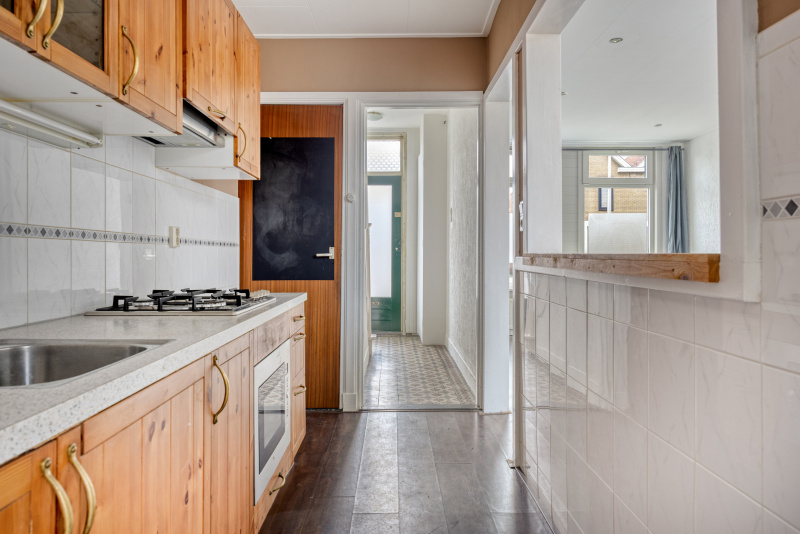 De halfopen keuken heeft een praktische rechte opstelling en is voorzien van gaskookplaat, afzuigkap, oven en spoelbak. Vanuit de keuken bereik je de ruime kelder, ideaal als provisieruimte of extra bergruimte. Aansluitend bevindt zich de uitbouw met bijkeuken, waar plaats is voor wasmachine en droger, evenals de toiletruimte en de doucheruimte.