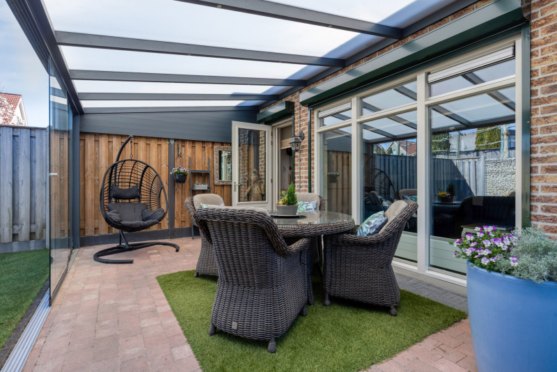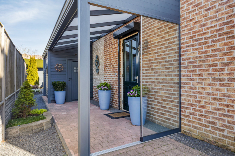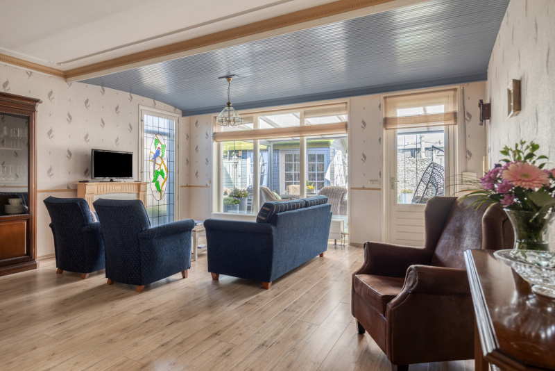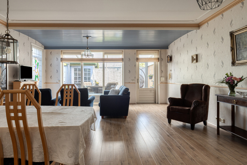 De verlengde woonkamer biedt volop leefruimte en sfeer. Het glas-in-loodraam geeft karakter en warmte, terwijl de grote raampartijen zorgen voor een prachtig zicht op de tuin. Vanuit de woonkamer loop je direct onder de overkapping die afsluitbaar is met glazen schuifpuien, ideaal om vrijwel het hele jaar buiten te ontspannen.