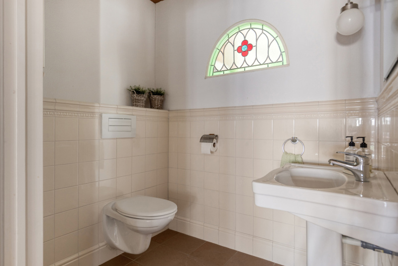 Via de afgesloten poort bereik je de overkapping aan de voorzijde, wat zorgt voor een beschutte en verzorgde entree. Vanuit hier stap je de woning binnen in de ruime hal met meterkast, trapopgang en een opvallend royaal toilet voorzien van wastafelmeubel en vloerverwarming.
