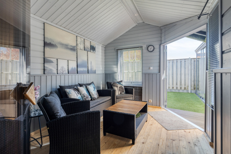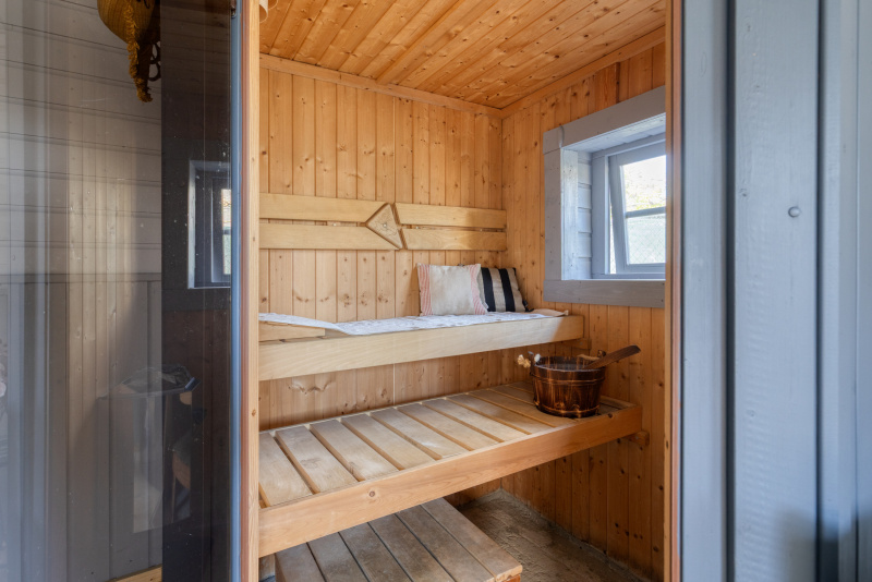 De tuin is keurig aangelegd en volledig ingericht op ontspanning. Hier bevindt zich de wellnessruimte met sauna, waardoor je thuis dagelijks geniet van rust en luxe.