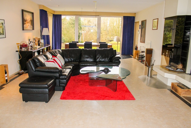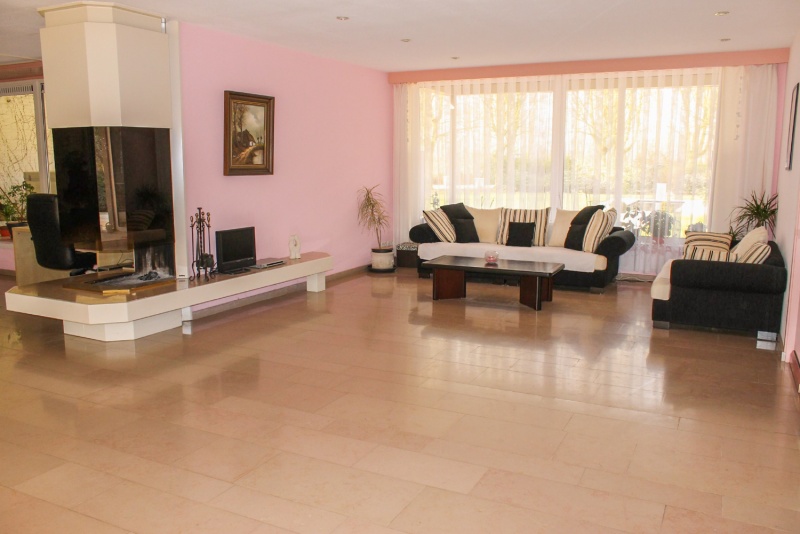 Links van de hal ligt de riante en sfeervolle woonkamer met een open haard op split-level niveau. Rechts van de hal vindt u de zonnige zit-/woonkamer met een open haard en grote raampartijen. De openslaande deuren zorgen dat de woonkamer in directe verbinding staat met het terras. Vanuit deze woonkamer komt u in de keuken, die voorzien is van alle gemakken en diverse inbouwapparatuur. Op de vloer ligt een fraaie natuurstenen tegel.