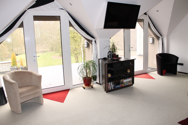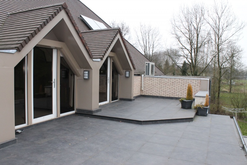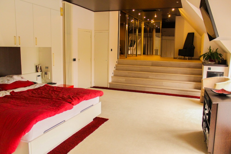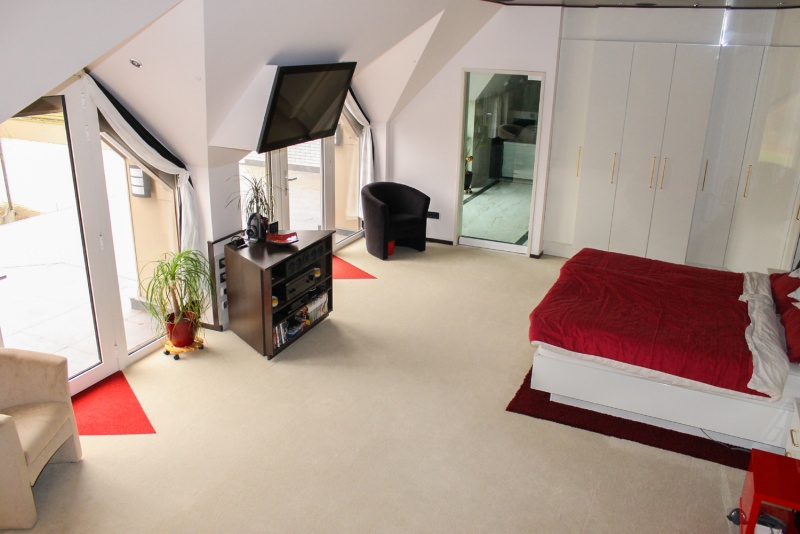 Op de verdieping treft u de grootste slaapkamer met een luxueuze badkamer en een kleedruimte (walk-in closet). Als u 's ochtend opstaat, kunt u heerlijk genieten van alle comfort in uw badkamer. Deze is voorzien van een grote douchecabine, een jacuzzi, wastafels en een toilet. Tevens grenst de slaapkamer aan het dakterras en kijkt u over de prachtige, parkachtige tuin.